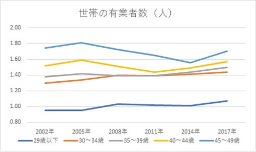▲出所『銀行員の教科書』有業者数を反映した可処分所得の推移。一人当たりの可処分所得は全般的には右肩下がりの傾向だ。